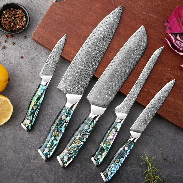 67-Layer Carbon Steel Eco-Friendly Kitchen Knife Set-5-Piece Japanese Chef Knife Set Authentic Deep-Sea Abalone Shell Handle