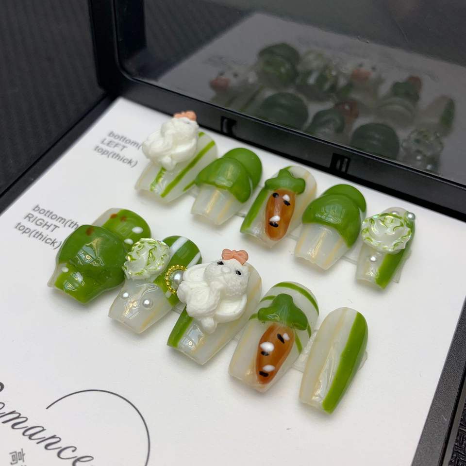 Factory Discount Short Trapezoid Cute Three-dimensional Little Monster Green Camellia Handmade Patch Gel Nail Fake Nails