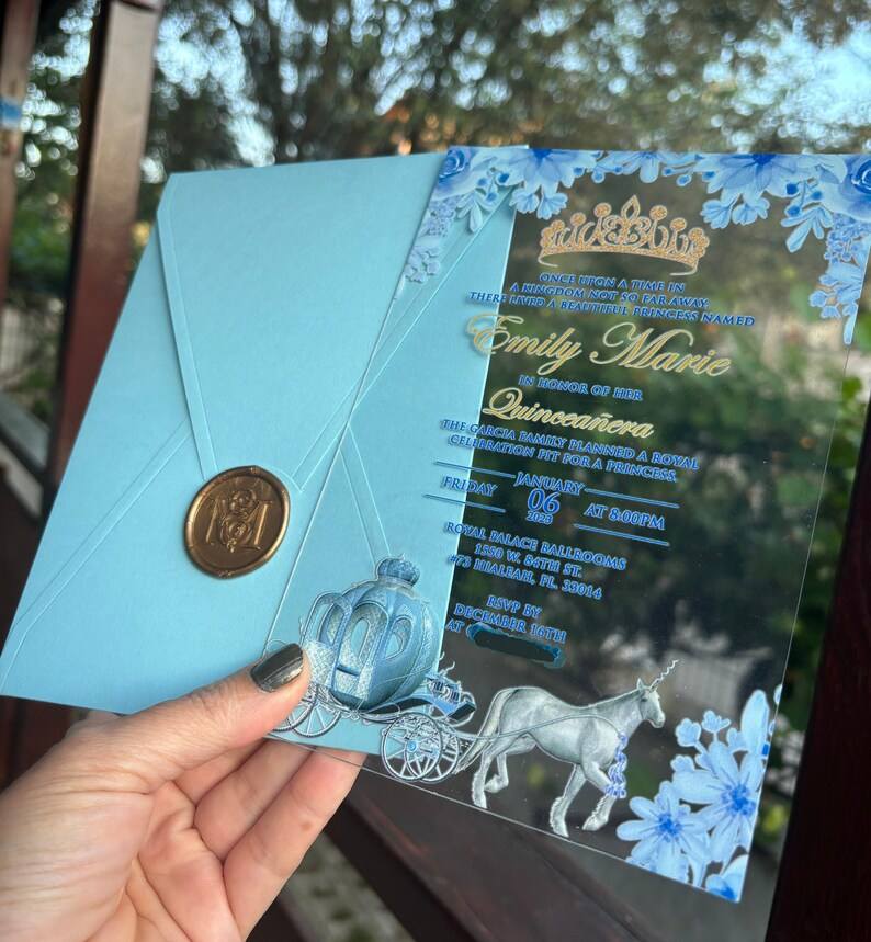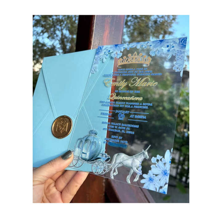 Styles sur le thème de la terre de conte de fées Couronne de princesse en acrylique clair Design personnalisé carte d'invitation douce 16 quinceanera avec enveloppe