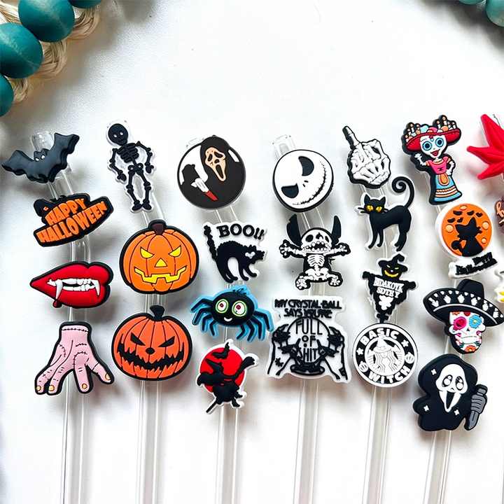 Halloween Horror Movie Pumpkin Silicone Tumbler Straw Topper Ghost Halloween Pvc Wholesale Straw Topper Charms Bulk Reusable