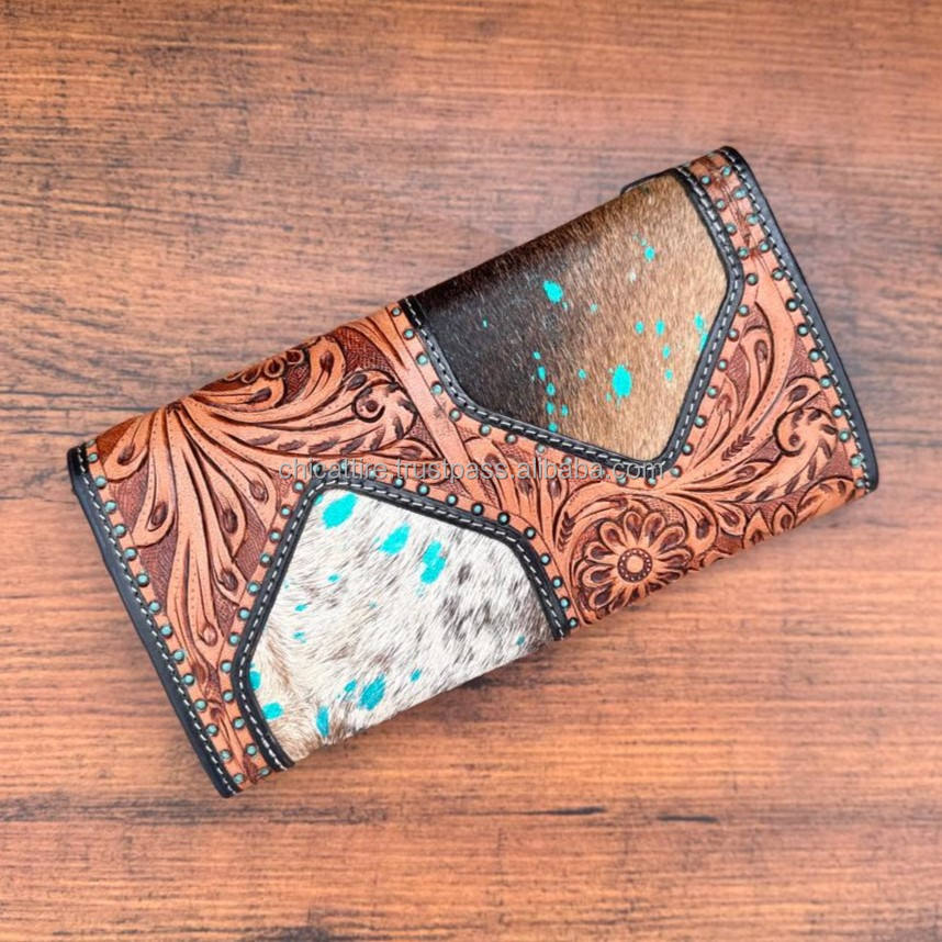 Pochette en cuir de fourrure de vachette sculpté à la main portefeuille Vintage Designer couleur marron cartes de crédit en cuir portefeuille cadeaux
