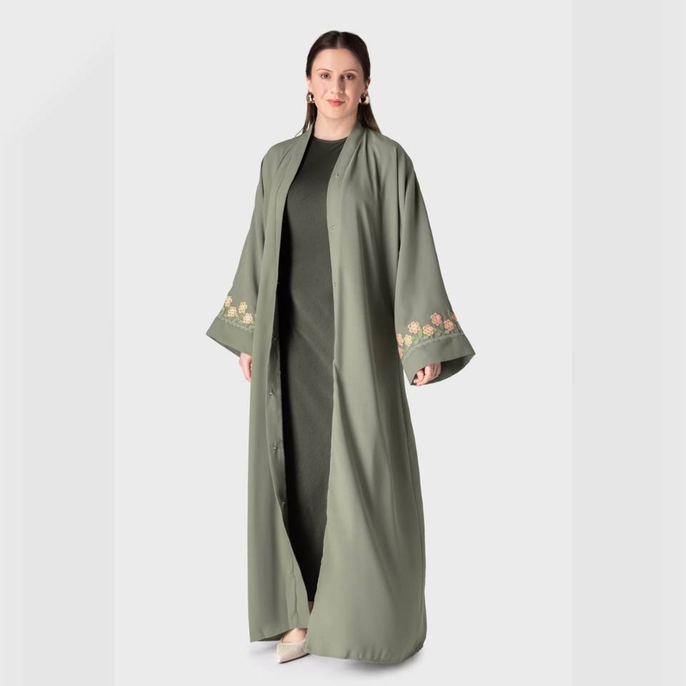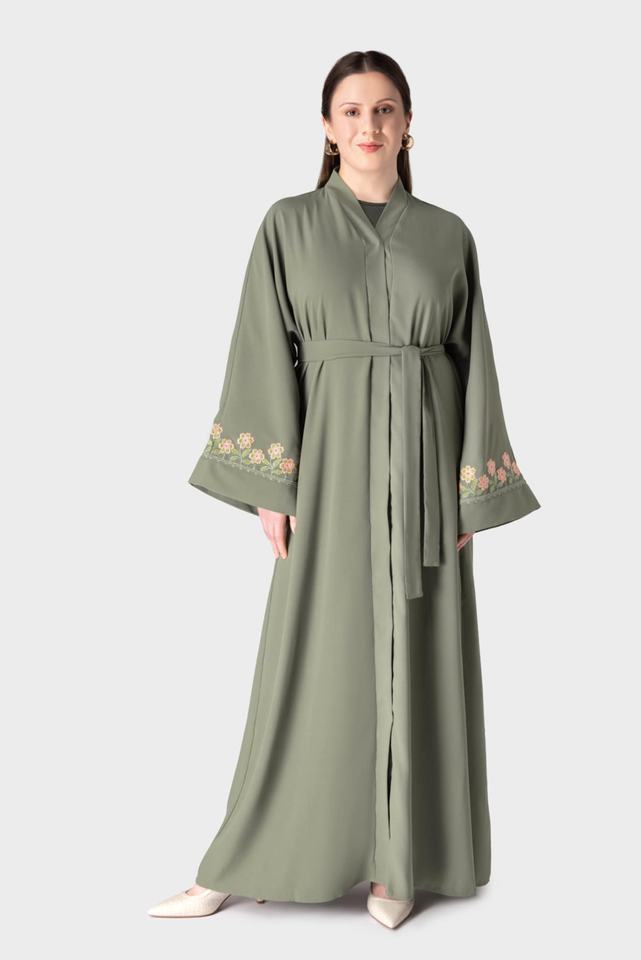 Handmade Embroidered Sage Green Satin Abaya for Adults Customizable Clothing with Ruffle Style XXL Size