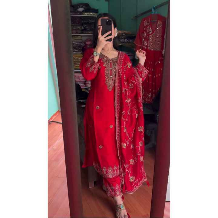 Dernier modèle de tenue chinoise brodée avec sequins, haut et bas avec dupatta rouge