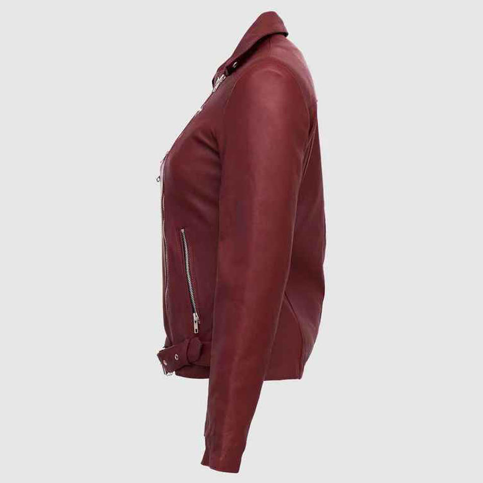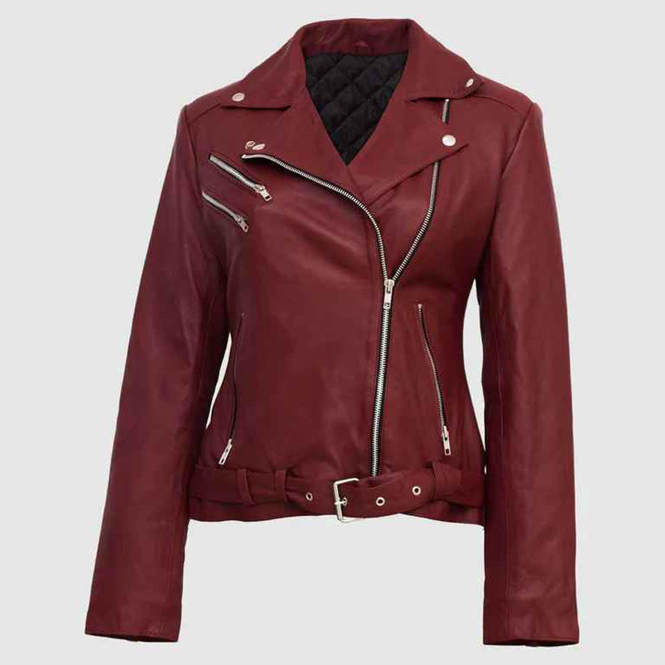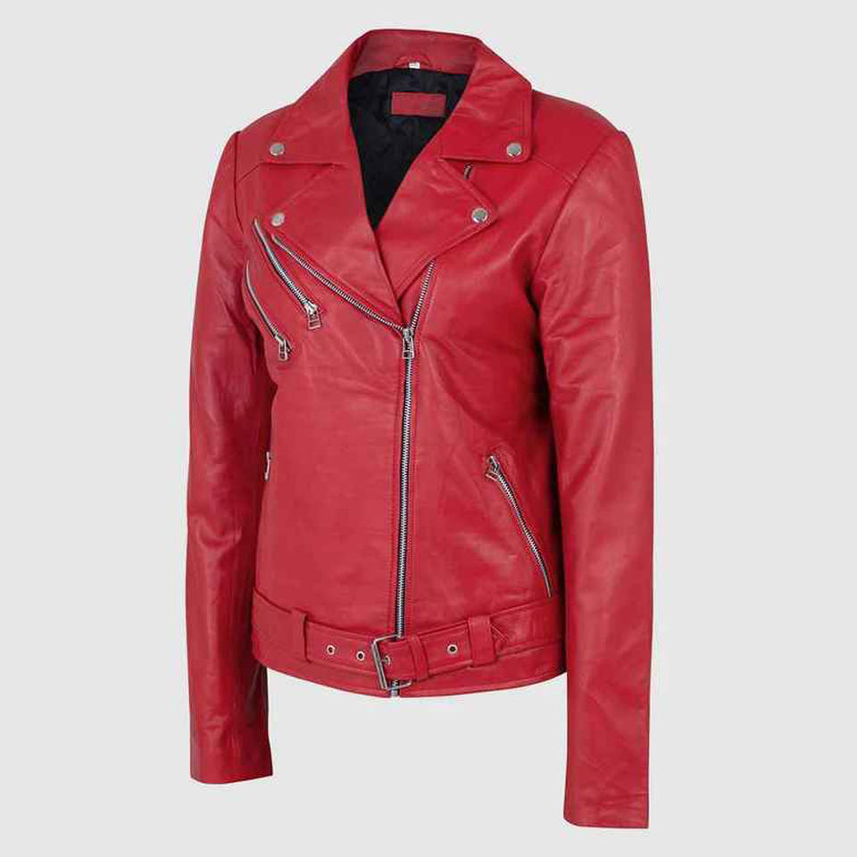 Dernier modèle Veste de style motard en cuir véritable souple pour femmes Col drapé Fermeture à glissière incurvée sur le devant Ceinture réglable à la taille.