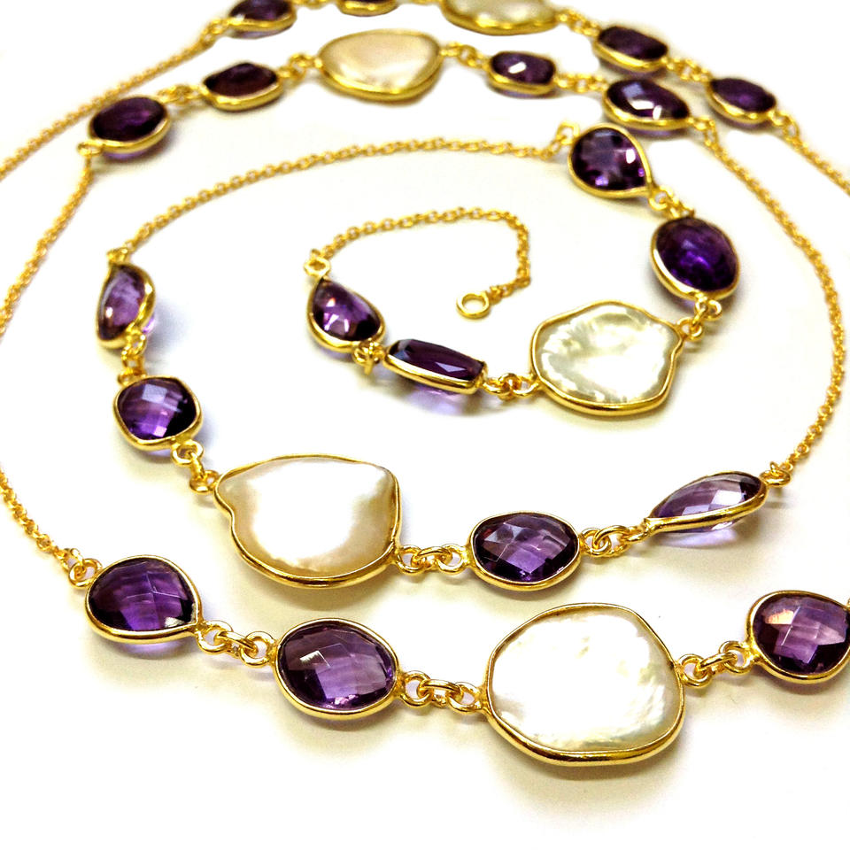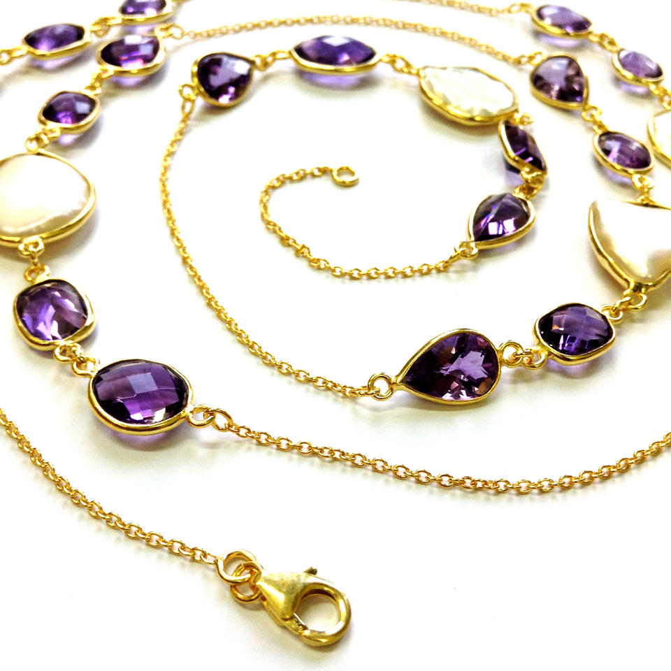 Luxe à la mode 925 argent Sterling plaqué or fête porter améthyste pierres précieuses dames porter longue chaîne collier