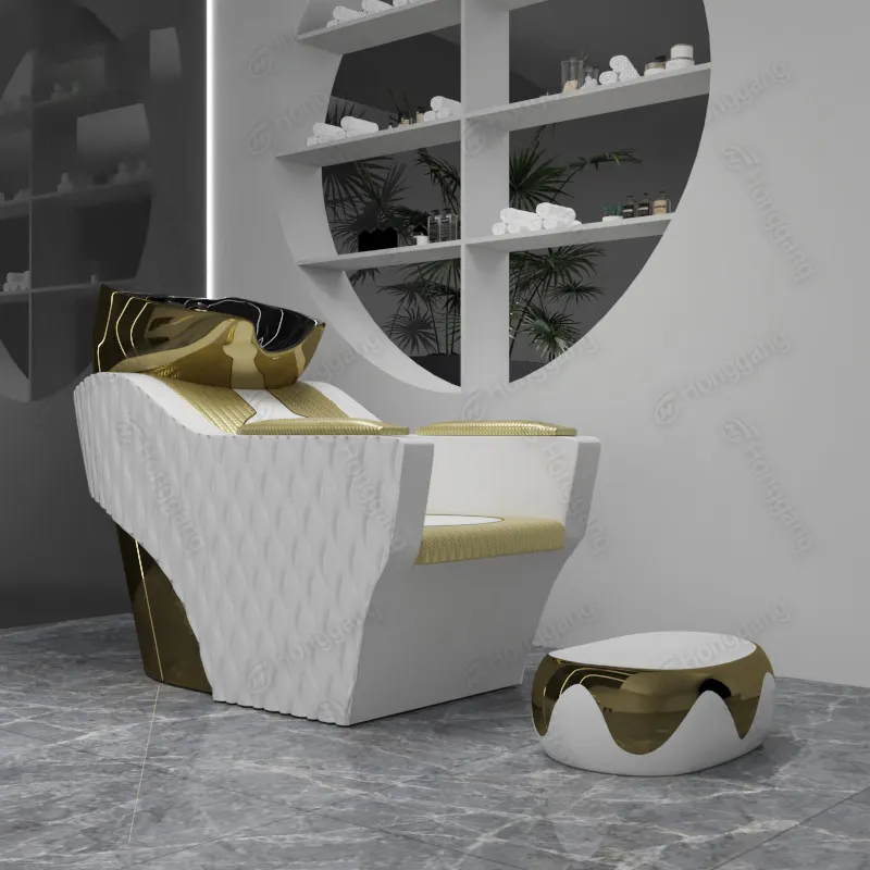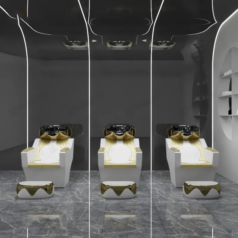 Meilleures ventes de spa de luxe en cuir synthétique plaqué or Lit de shampoing allongé pour hôpital et salon haut de gamme