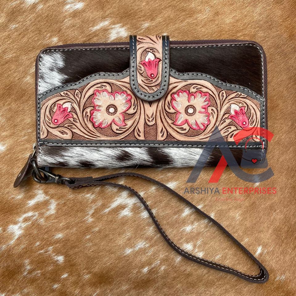 Nouvel arrivage Portefeuille sculpté usiné à la main Étui de téléphone Portefeuille élégant en cuir de fourrure de vachette Multi Uses Western Stylish Portefeuilles