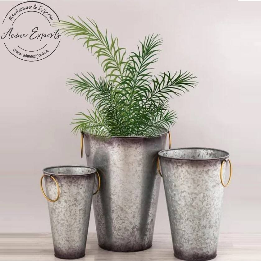 Set of 3 Handcrafted Galvanized Metal Planters with Golden Hoop Handles New Design for Indoor Outdoor Planting for Home Garden
