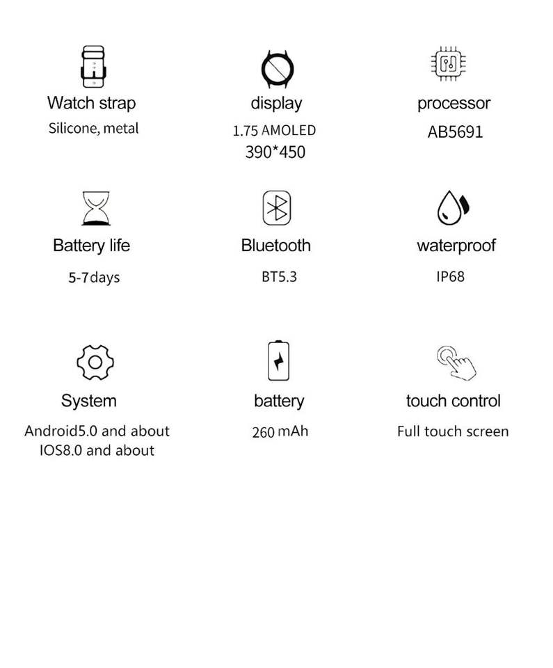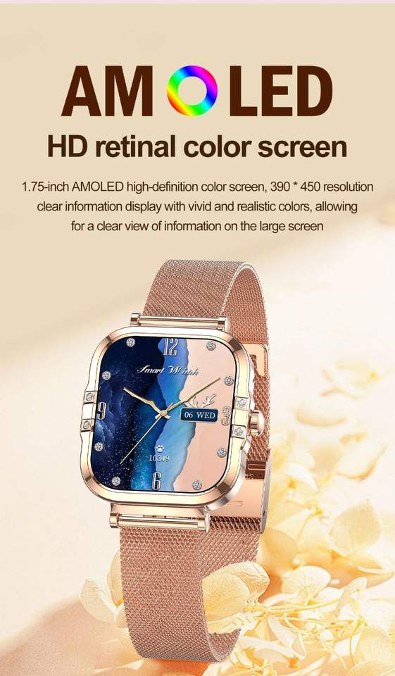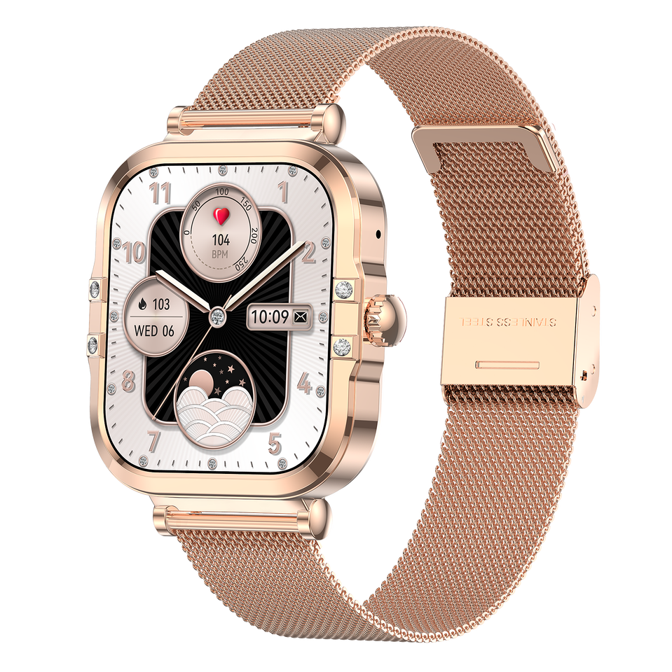 Calendrier, Alarme horloge, Télécommande, Sommeil, Pisteur fitness, Compteur de pas, Rappel de Téléphone, Répondre à un appel, Lancer essage, Rappel de message, Composez un numéro, Fréquence cardiaque Tracker, Traceur de calories, Moniteur de Souffle, Multiport Tracker, Lecteur de musique, Rappel sédentaire, Bouton SOS, Gestion menstruelle, Assistant vocal AI, CalculatricesFonction