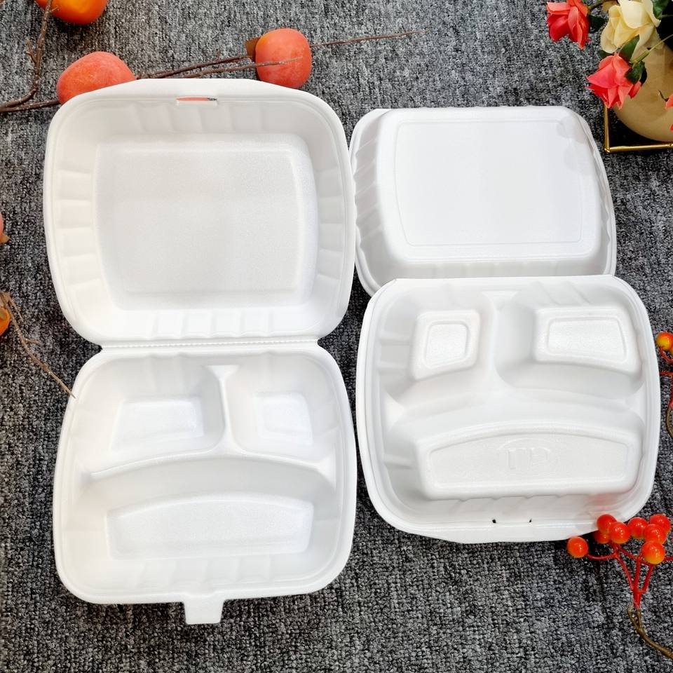 Récipient alimentaire en mousse PS à trois compartiments avec couvercle boîte à lunch/restauration rapide/hamburger fabrication à emporter jetable