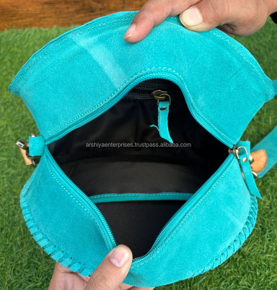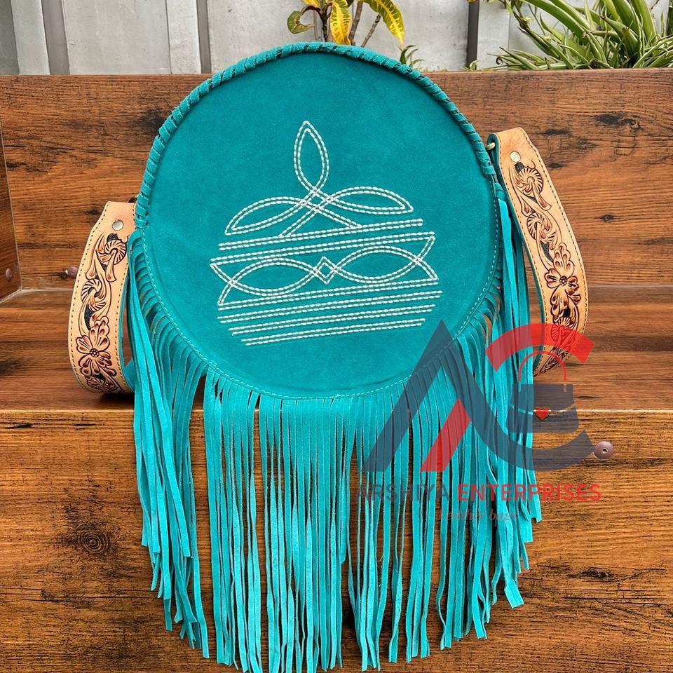Hand Tooled Suede Leather Round Fringe Bag