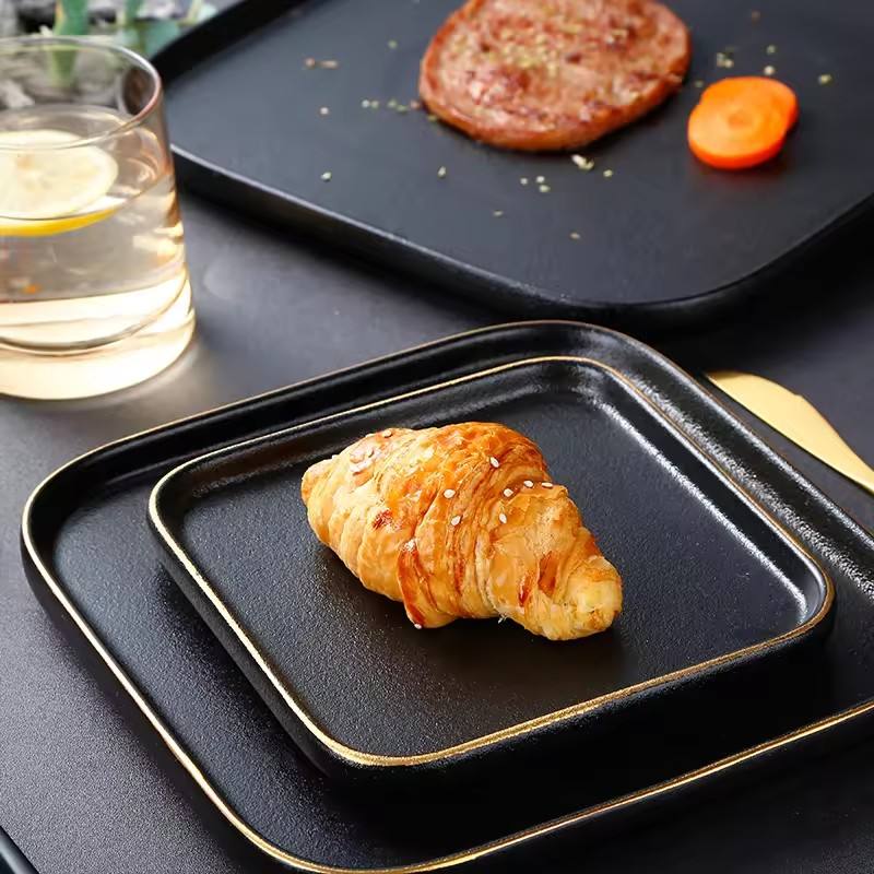 Nom du produit:Assiette à dîner en céramique carrée noire avec bord doré
