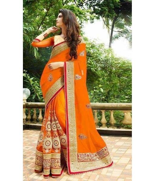 Fashionable Designer Cotton Silk Orange Color Heavy Embroidered and Stone Work Saree Indian Women Wear Wholesaler Price Apparelgarment