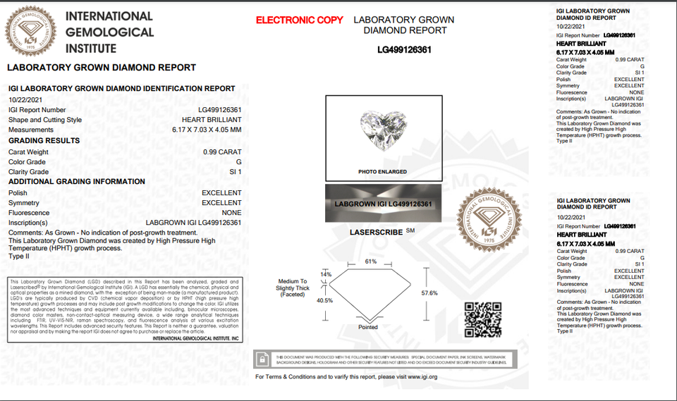 0.99ct Heart Cut Lab-grown Diamond IGI Certified G Color SI1 Clarity Lab-Stone