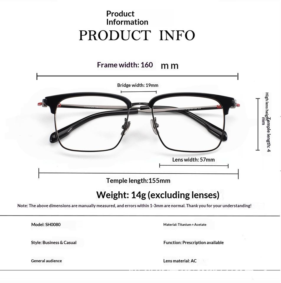 Monture de lunettes pour hommes 0080, grande taille 160 mm, carrée, à monture complète, en titane pur, vente en gros de montures de lunettes