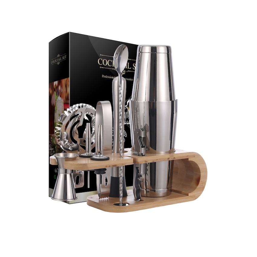 Ensemble de shaker à mojito en acier inoxydable 04 avec support en bambou pour boisson mixte, ensemble de shaker à cocktail en bois, kit d'outils de bar en acier inoxydable
