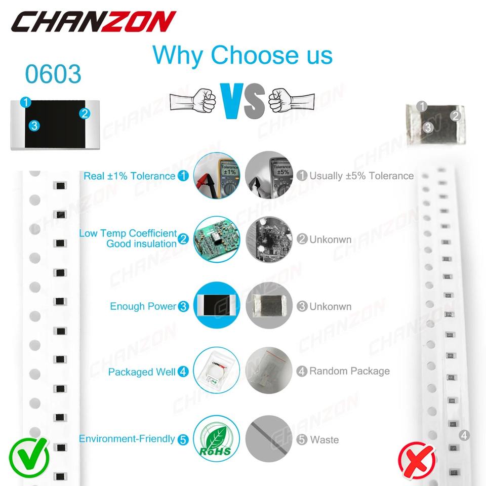 0603 SMD Résistance 100 Pcs 0ohm - 10M Ohm 1/10W 0.1 W 0.1 Watt 1% Haute Précision Film Puce Résistance Fixe 0 0.01 1 2 3 10 11 20