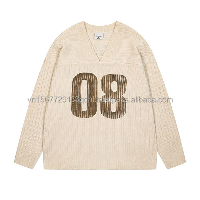 Pull en jersey tricoté à col en V rayé avec imprimé numéro 08 pour femme, 100 % polyester, style sportif, ample, décontracté, tendance, de marque