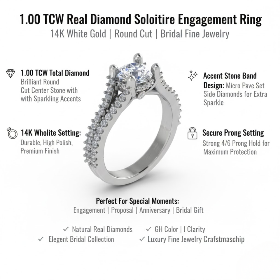 Bague de fiançailles solitaire en diamant véritable 1,00 TCW pour femme en or blanc 14 carats | Bijoux de mariée raffinés à taille ronde avec pierres d'appoint