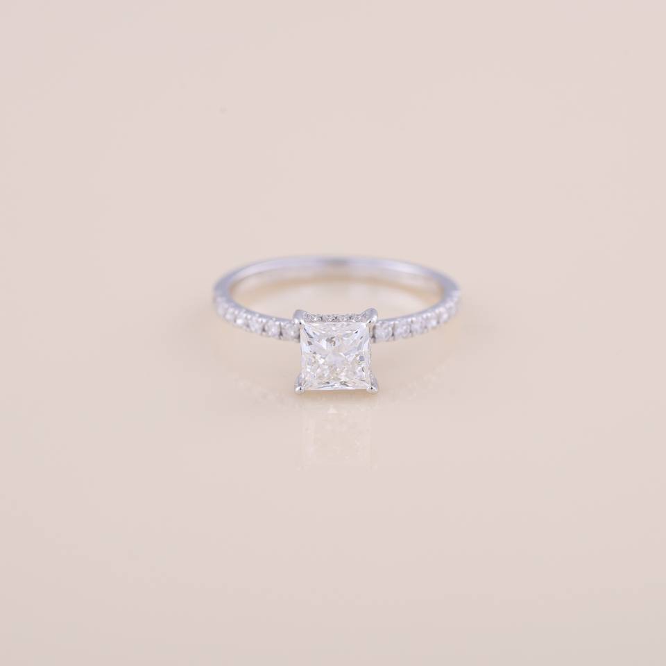 Bague de fiançailles en diamant de laboratoire taille princesse 1,35 carat, sertie de 4 griffes, plaquée rhodium, style luxueux, pavé, or 9 carats blanc/jaune/rose