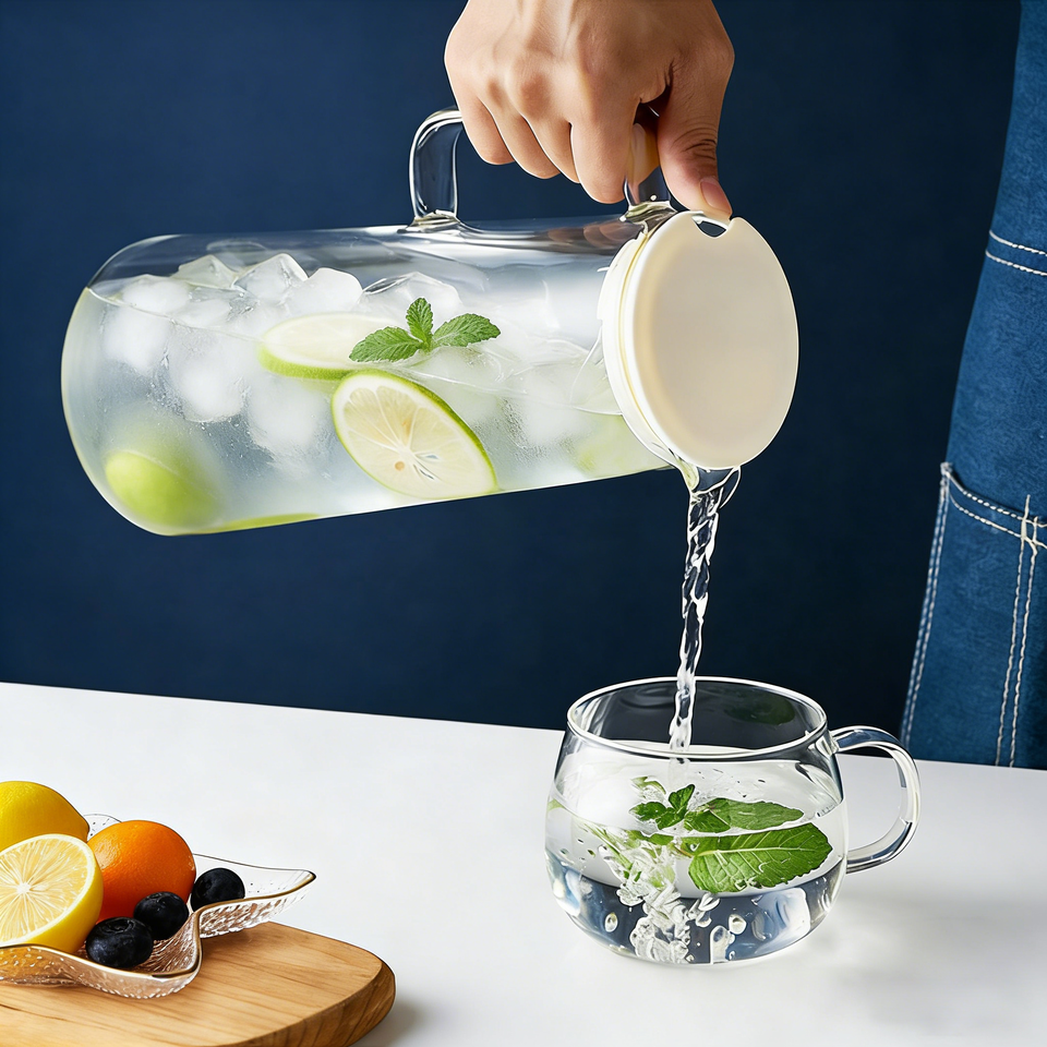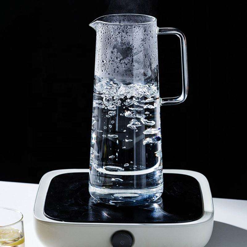 Pichet à eau en verre borosilicate de 1,35 L avec couvercle et filtre | Carafe à boissons résistante à la chaleur avec poignée pour jus et boissons froides