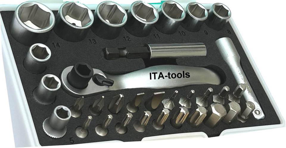 Jeu de douilles et embouts CV de 33 pièces de 1/4 po avec poignée à double tête flexible, fonctionnement manuel, étui rigide inclus, personnalisable ODM/OEM