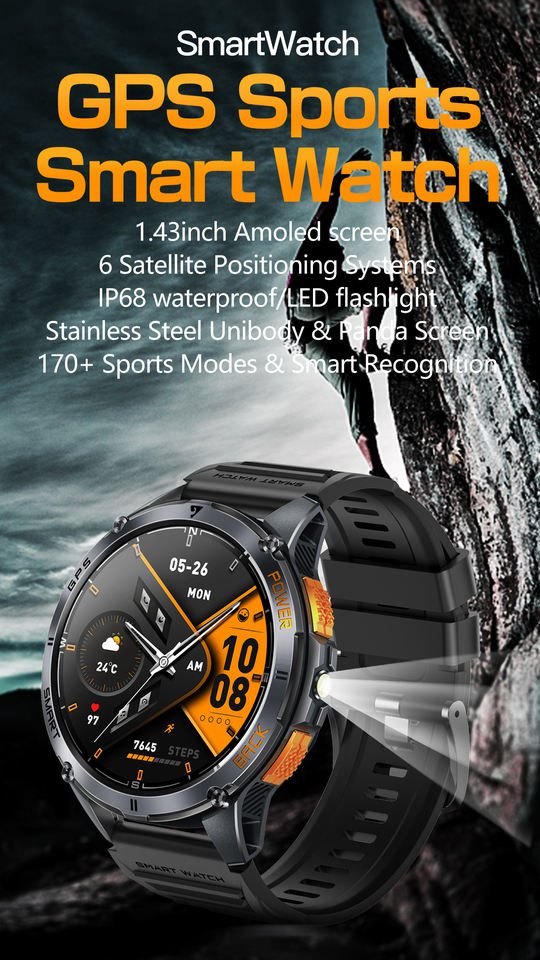 Montre connectée sportive K67A avec écran AMOLED de 1,43 pouce, lampe de poche, étanche IP68, assistant vocal IA, contrôle de la musique, boussole, GPS, autonomie de 5 à 10 jours