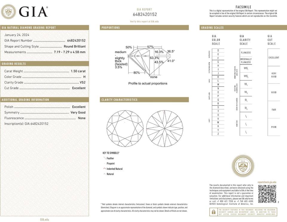 Diamant naturel rond de 1,50 ct, couleur H, pureté VS2, taille excellente, finition EX, certifié GIA, pour la création de bijoux DIY.