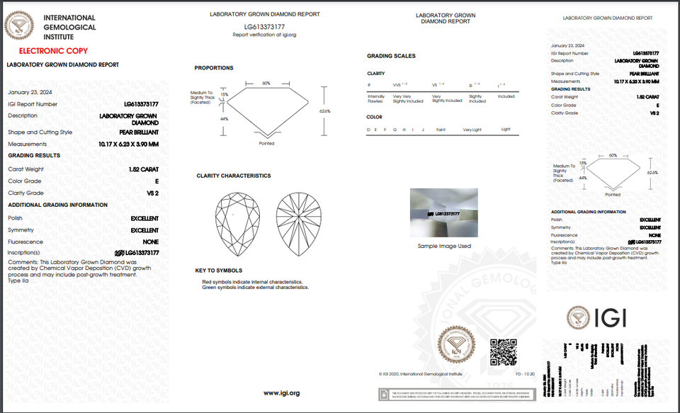 Diamant de laboratoire 1.52 ct coupé en poire certifié IGI E Color VS2 Clarity Lab-Stone