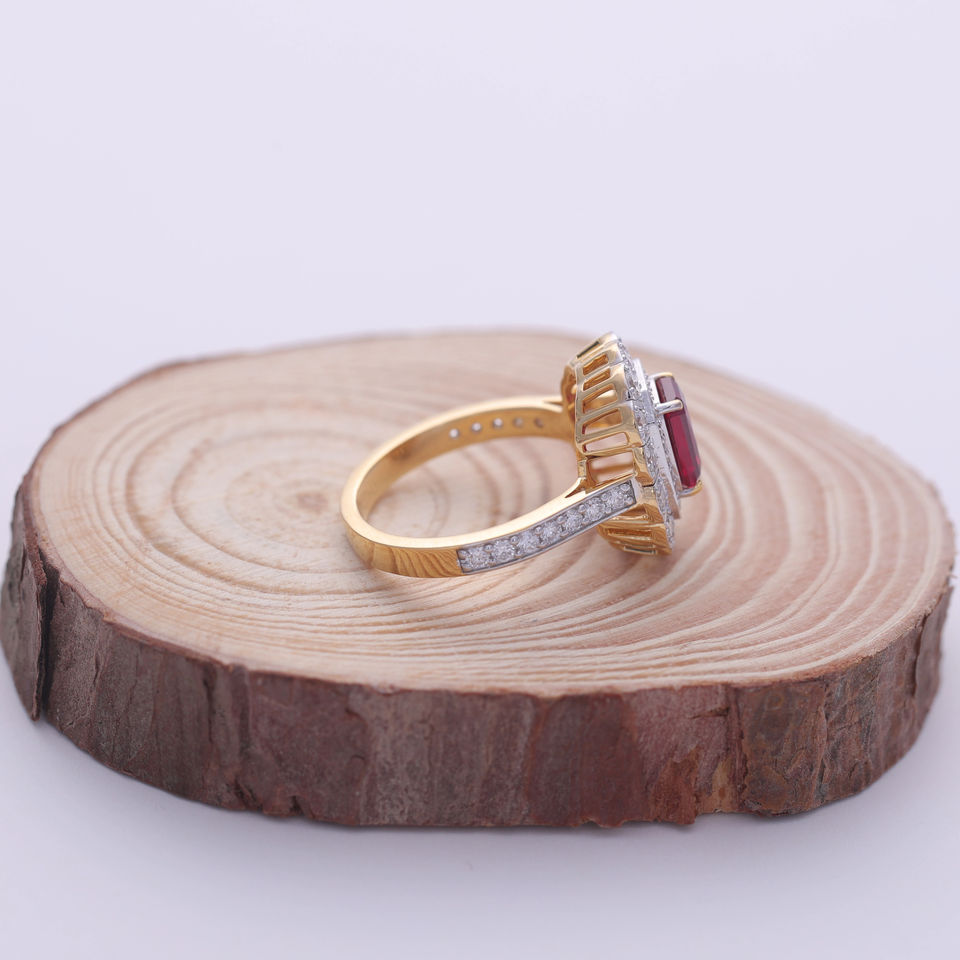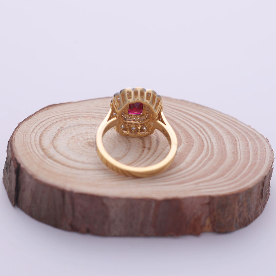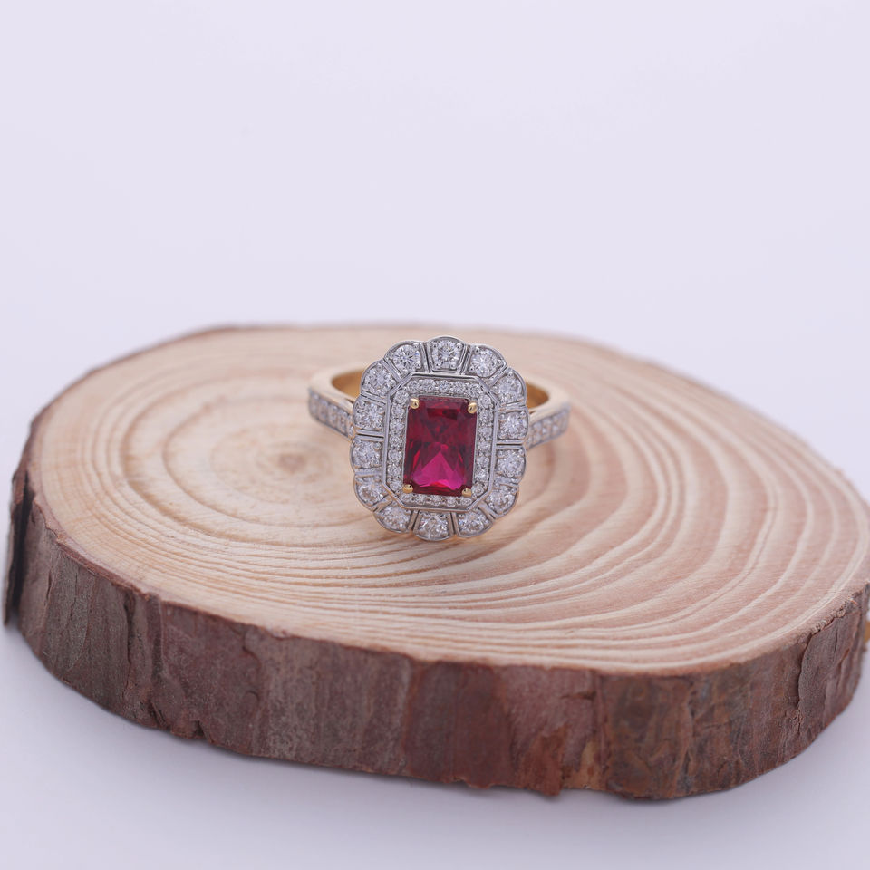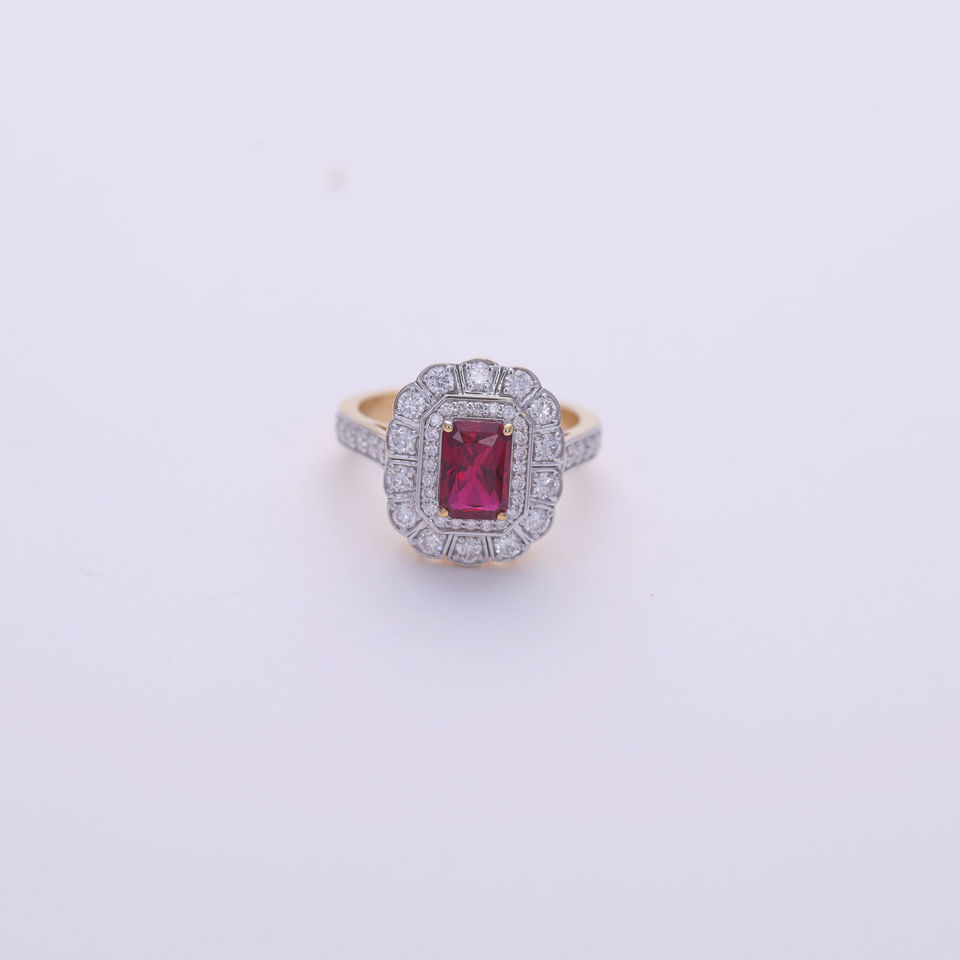 Bague en or jaune/blanc/rose 18 carats avec rubis taille radiant certifié IGI et halo de diamants