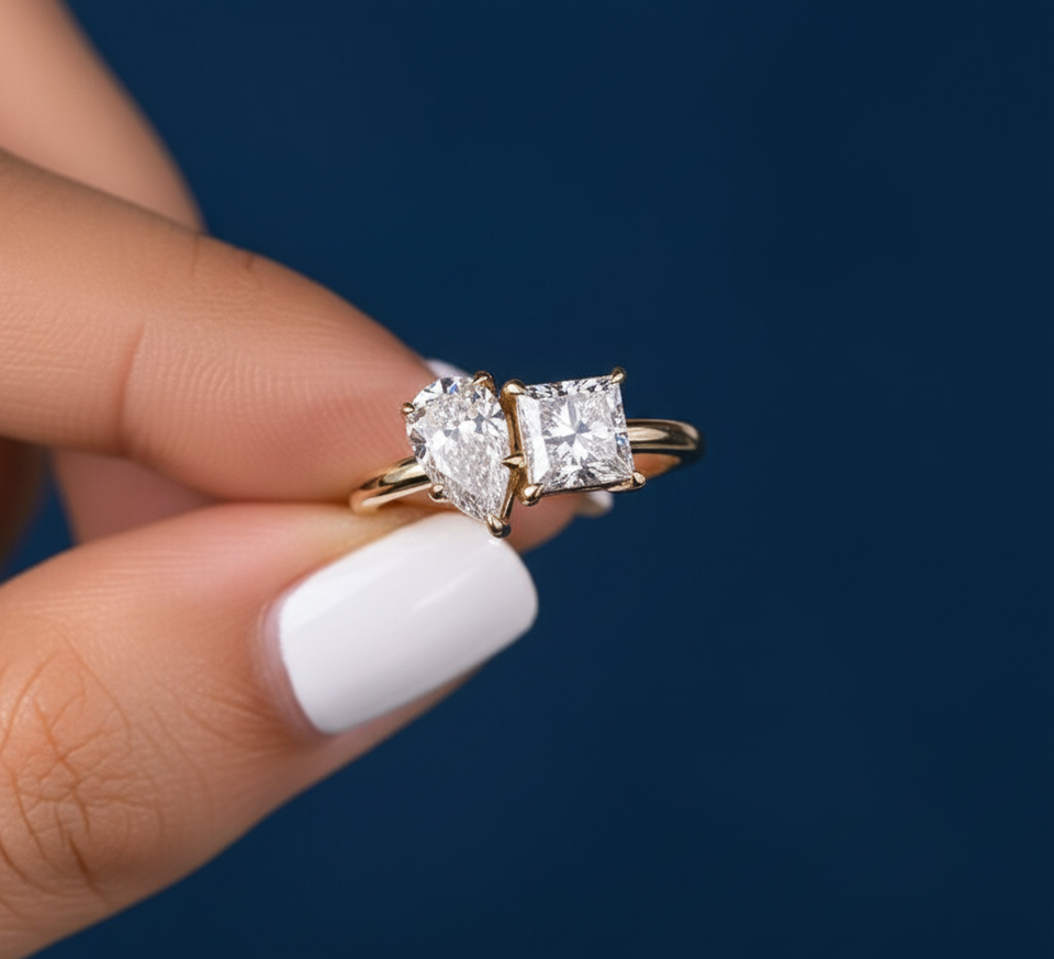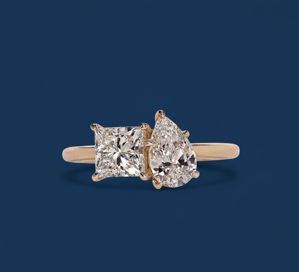 Bague de fiançailles pour femme Toi et Moi à deux pierres, diamant de laboratoire taille poire princesse de 1,70 carat, or jaune 14K plaqué rhodium, VVS2 F IGI