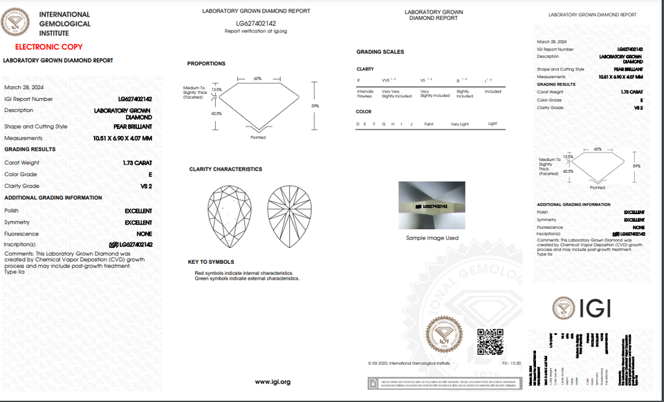 Diamant de laboratoire 1.73 ct coupé en poire certifié IGI E Color VS2 Clarity Lab-Stone
