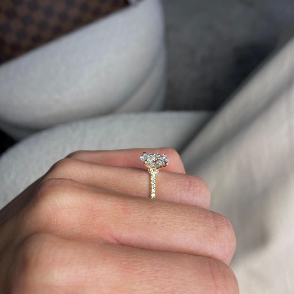 Bague en diamant de laboratoire ovale de 1,80 carat _ Sertissage unique avec halo caché et pierres latérales _ Or jaune 14 carats _ Certifié IGI D - VVS2