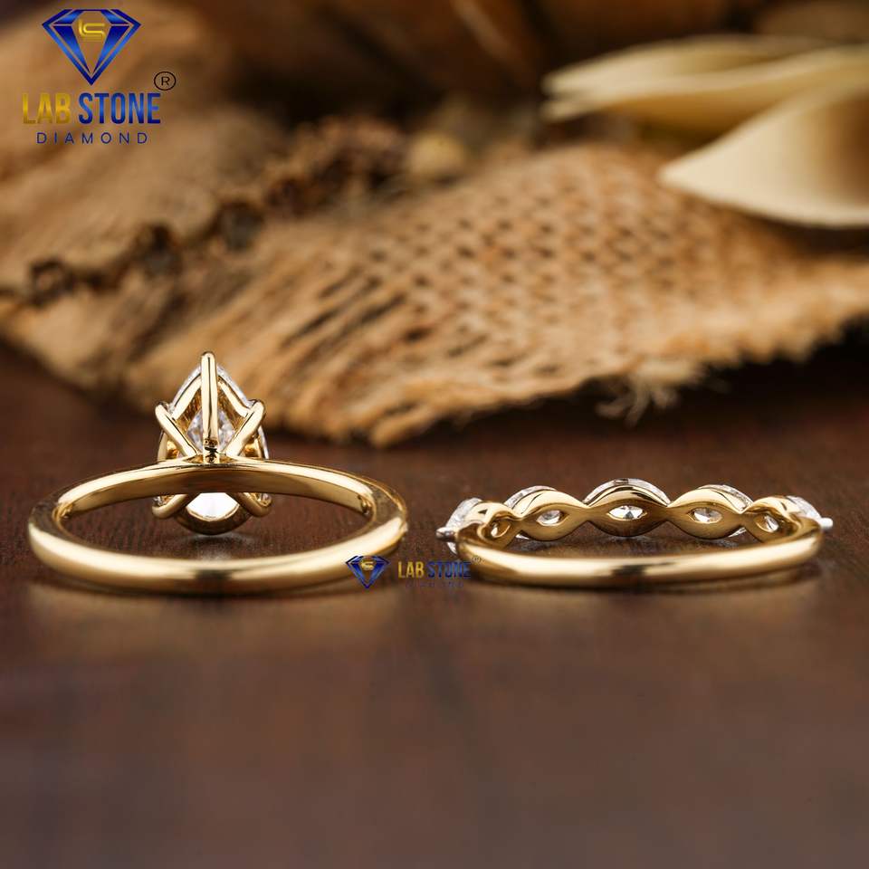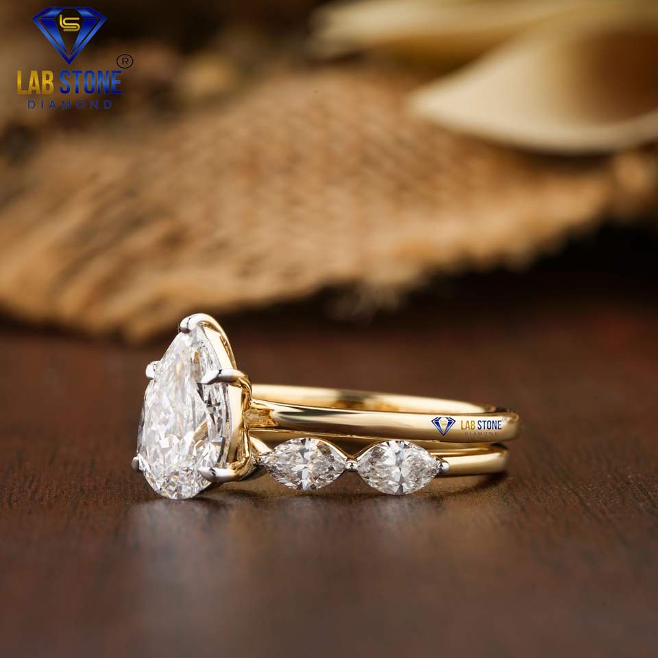 Bague en diamant taillée poire et marquise 1.87 TDW Bague solitaire en or jaune 18 carats avec bande de broches partagée Hpht/Cvd Diamond Lab Stone