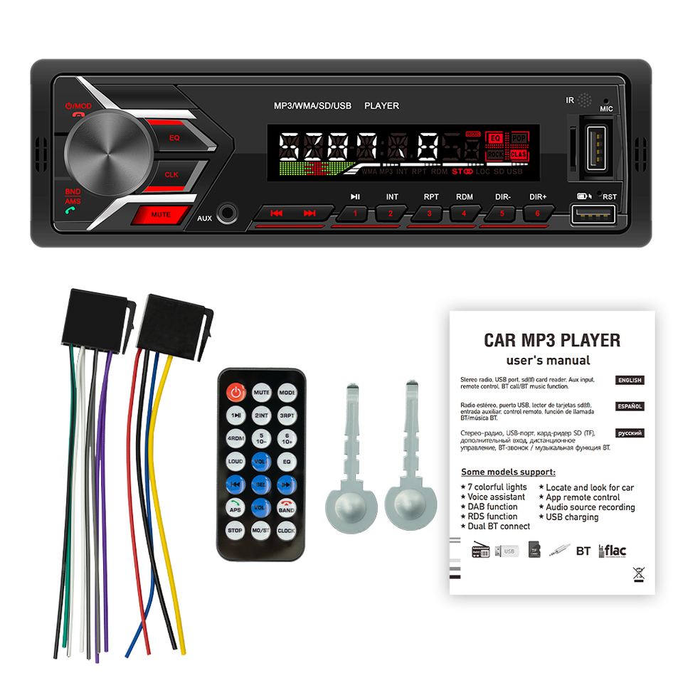 Stéréo, Chargeur de Voiture, Transmetteur fm, Télécommande, Mains-libre, Amplificateur, Contrôle de l'application, Lumières colorées, Mémoire de Mise Hors tension