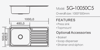 Évier de cuisine à une cuvette en acier inoxydable de 1 mètre avec plateau 304/201 avec égouttoir