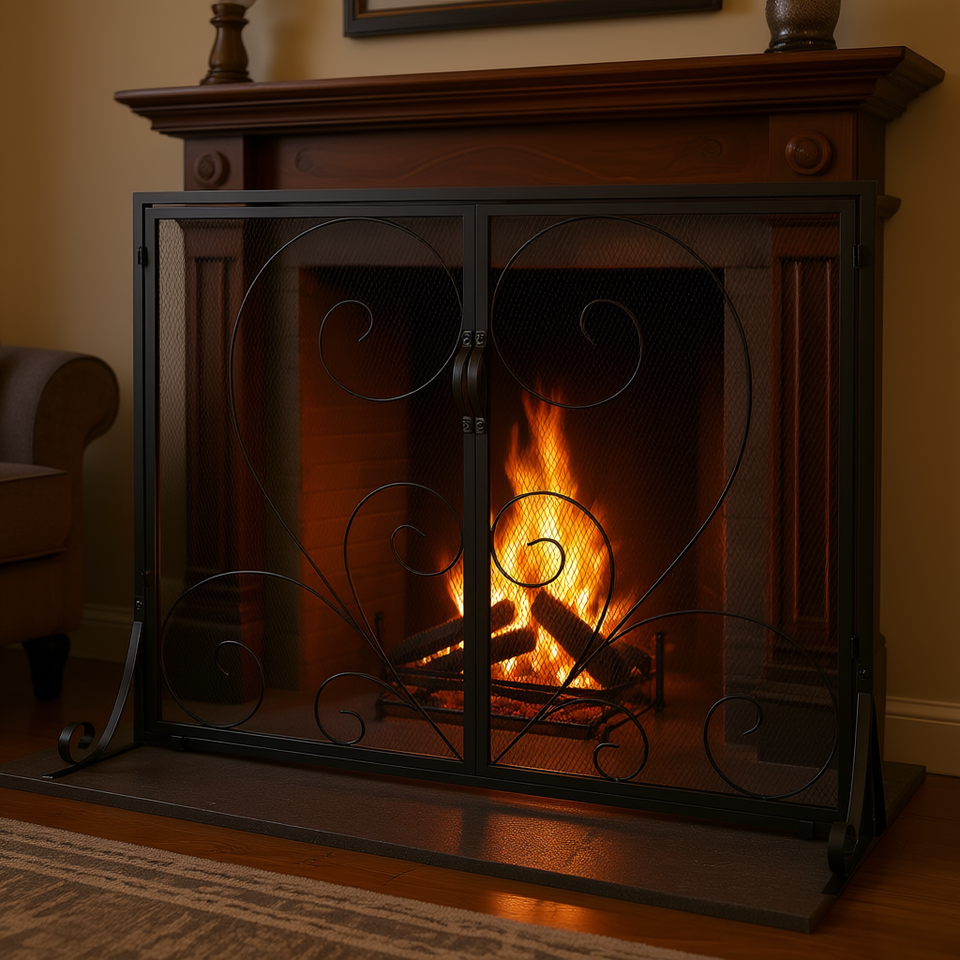 Paravent de cheminée en fer 39 po x 31,6 po, noir vintage, traditionnel, autoportant, protection anti-étincelles pour salon