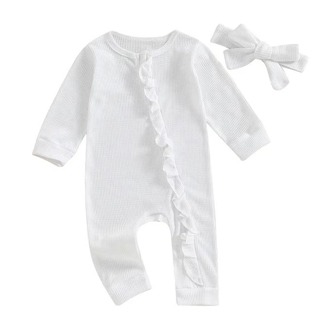 1 pièce marque privée pour bébés filles et garçons barboteuse vêtements à manches longues fermeture éclair à volants combishort nouveau-né combinaisons et bandeau