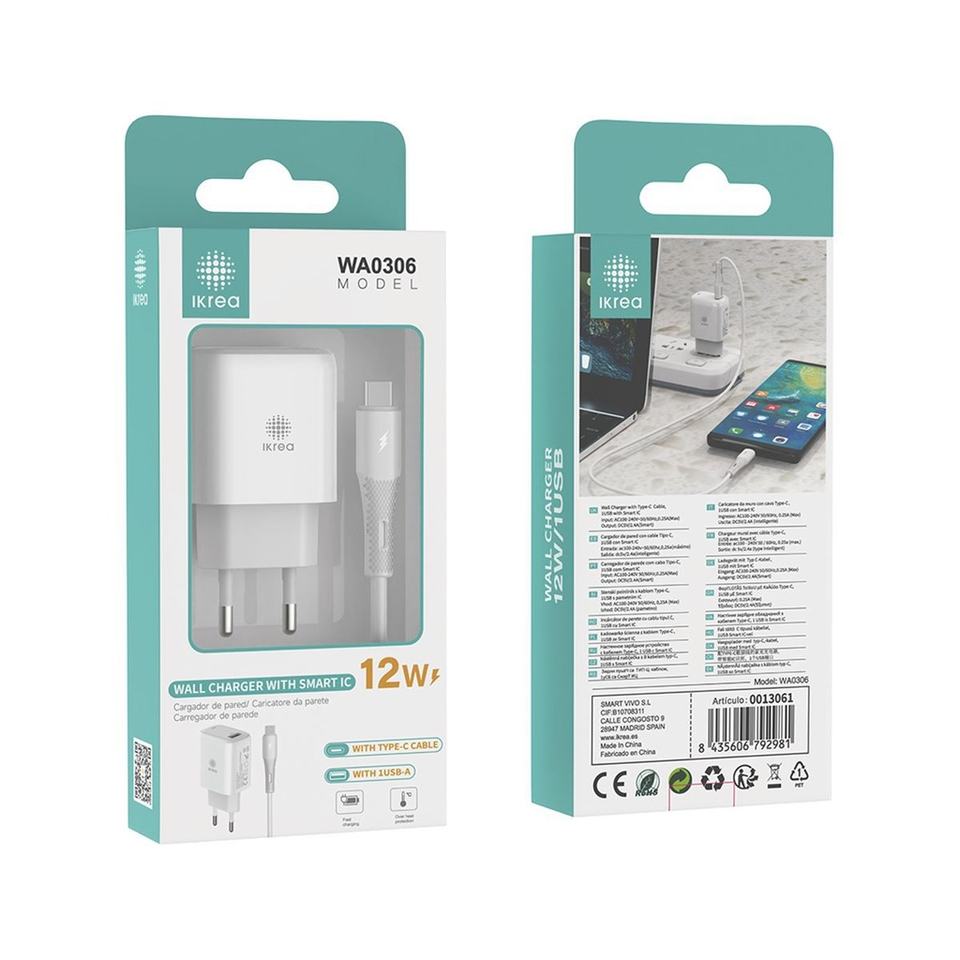 Chargeur rapide USB-A à 1 port avec câble Type-C 12W Blanc-Chargeurs