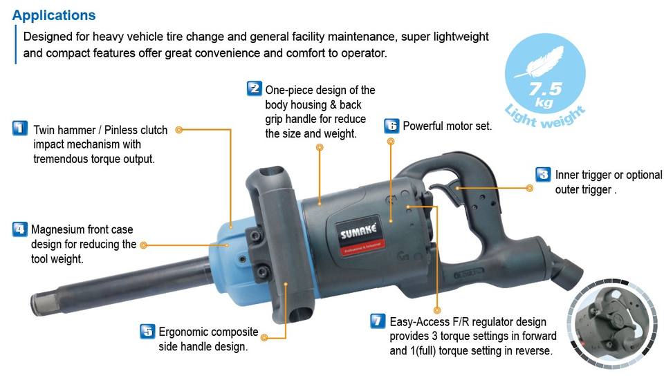 1" Professional Twin Hammer Air Impact Wrench with 1/2" Drive and 3118 Nm Max Torque by SUMAKE OEM Customized Support