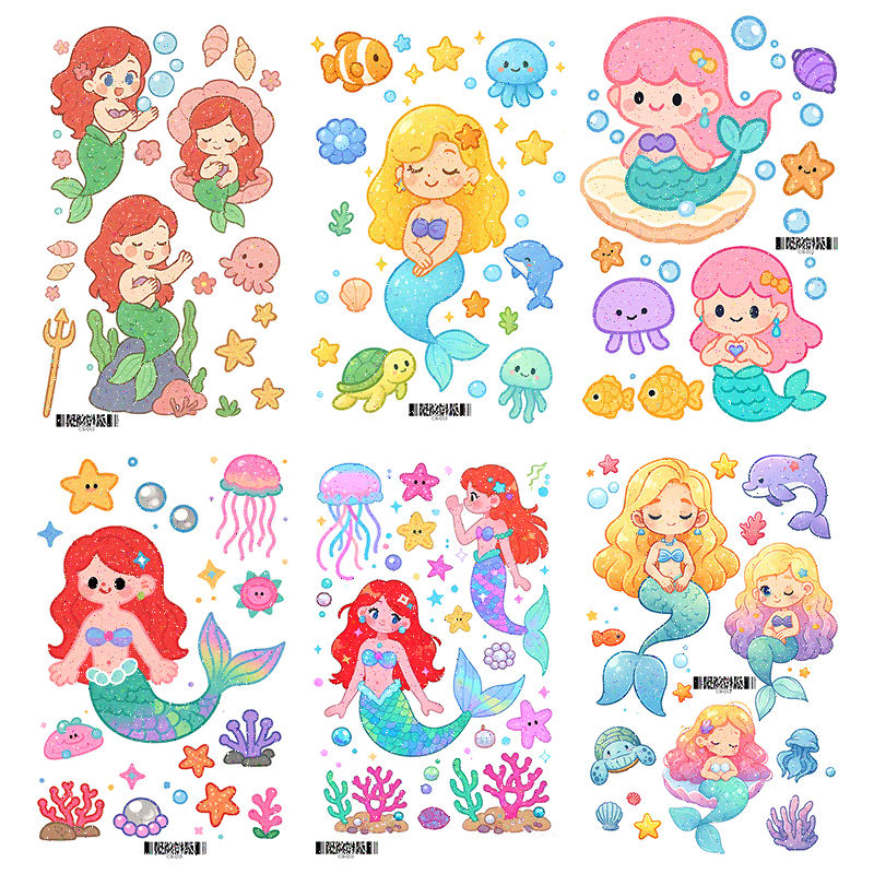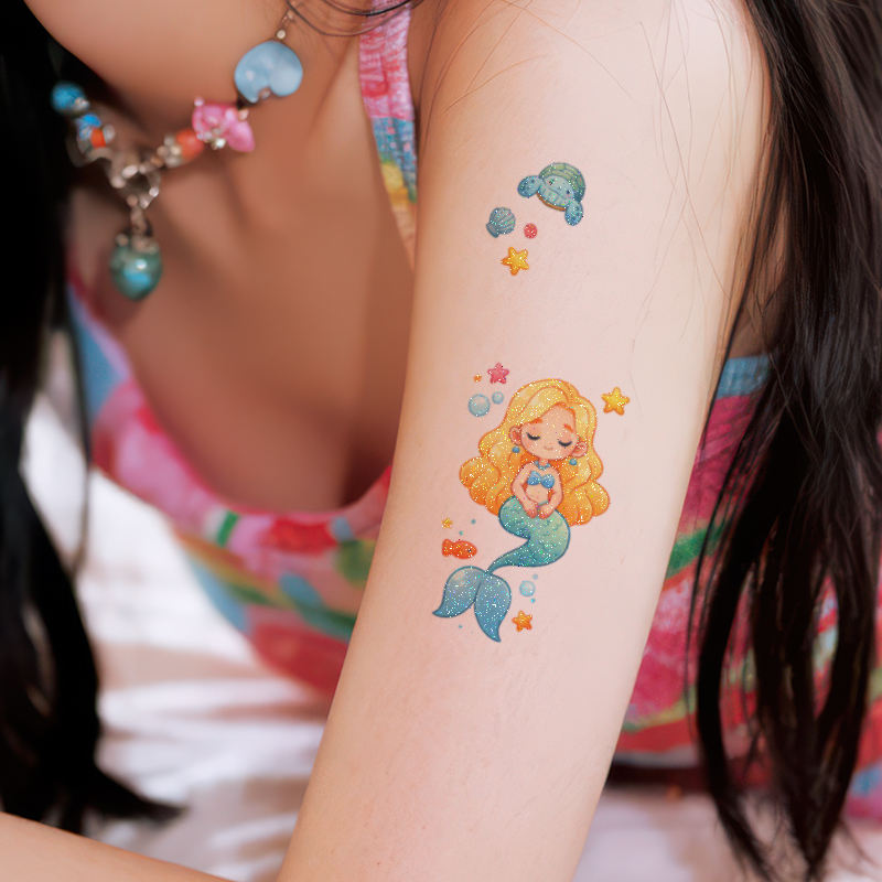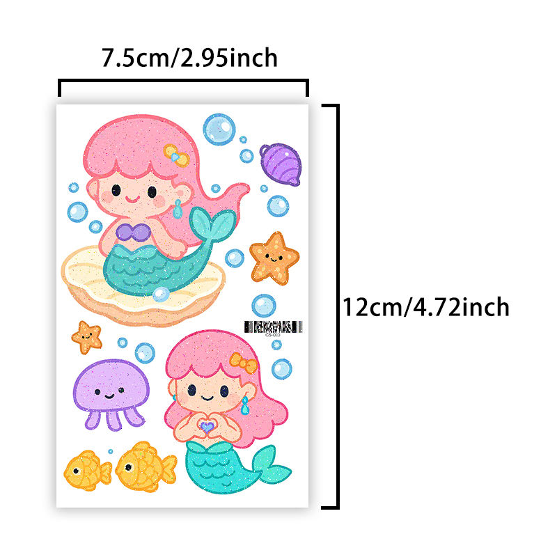 1 jeu de 6 feuilles de tatouages temporaires à paillettes colorées autocollant mignon sirène dessin animé tatouage étanche pour visage bras jambe