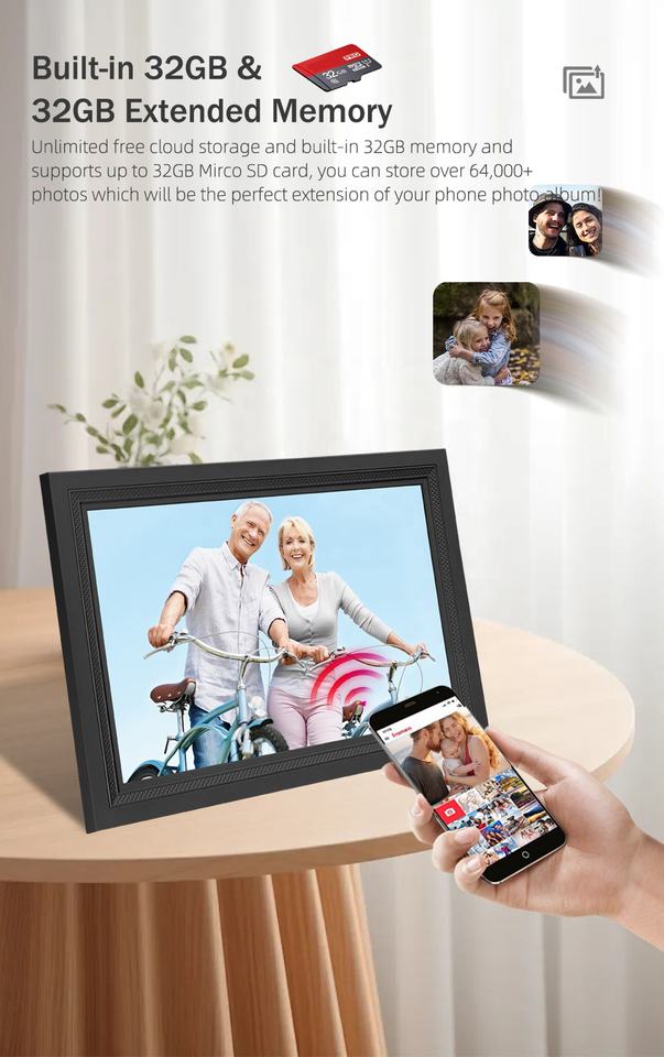 Cadre photo numérique 10,1'' avec 32 Go, cadre photo numérique avec écran tactile, partagez des photos, des vidéos, envoyez des vœux via une application gratuite