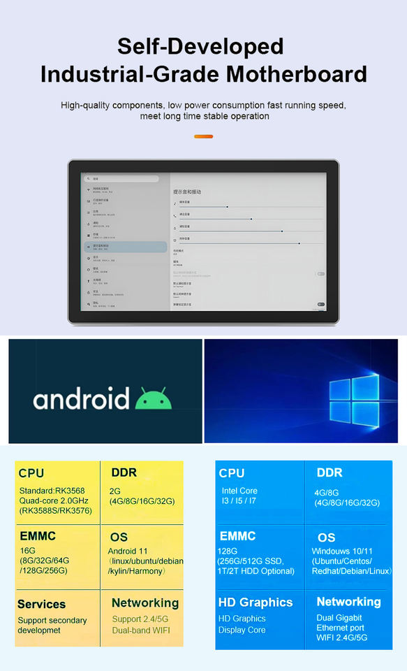 CPU:RK3576/RK3568/RK3588, i3/i5/i7 6ème/8ème/10ème facultatif
