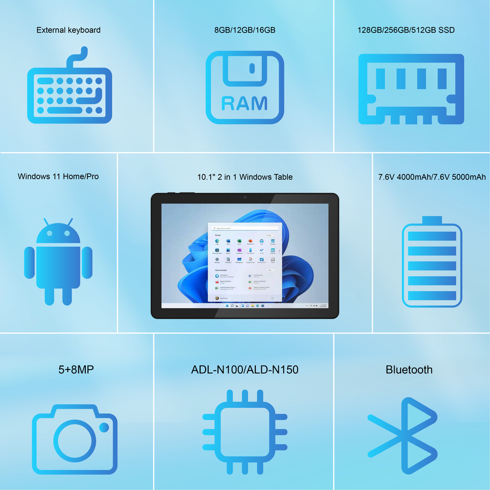 Tablette PC 10,1 pouces Windows 11 12 Go Wi-Fi Intel N150 2-en-1 Écran tactile avec support de clavier Boîtier en métal