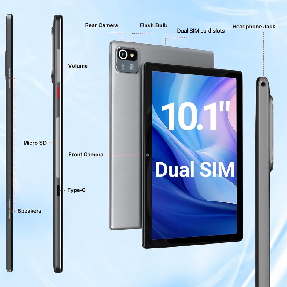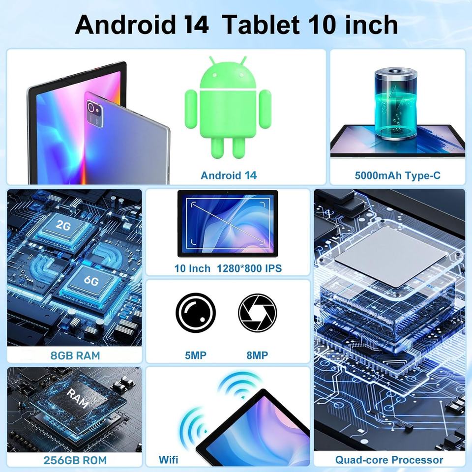 Tablette 10,1 pouces double SIM Quad-Core 8 Go + 256 Go, écran tactile capacitif, Android 14, GSM/Wi-Fi 5G, tablette PC pour l'apprentissage et le divertissement des enfants