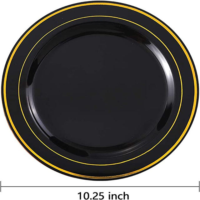 Assiettes jetables en plastique noir pour dîner de mariage de fête du Nouvel An de 10.25 pouces avec bord doré