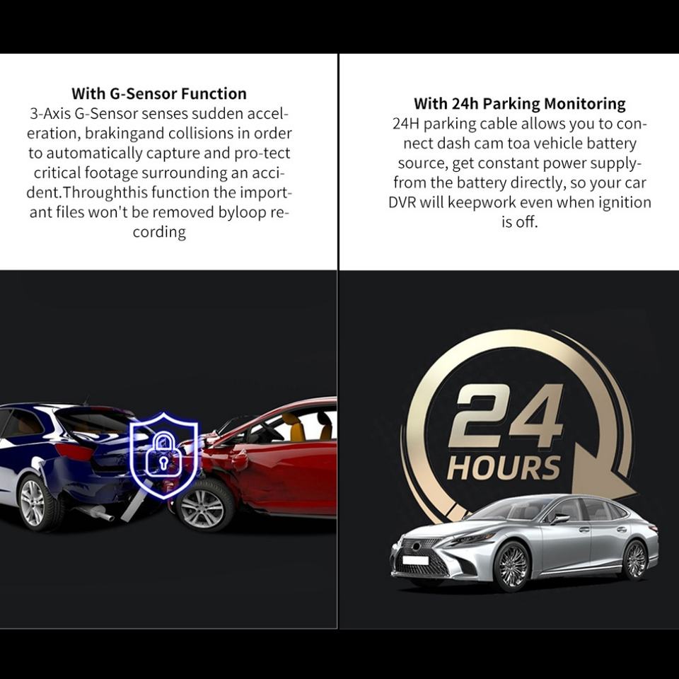 Bluetooth, Vision nocturne, G-sensor, MODE park, Enregistrement en boucle, Intégré WiFi, Détection de mouvement, L'interaction vocale, D'urgence Accident Serrure, Batterie IntégréeFonction