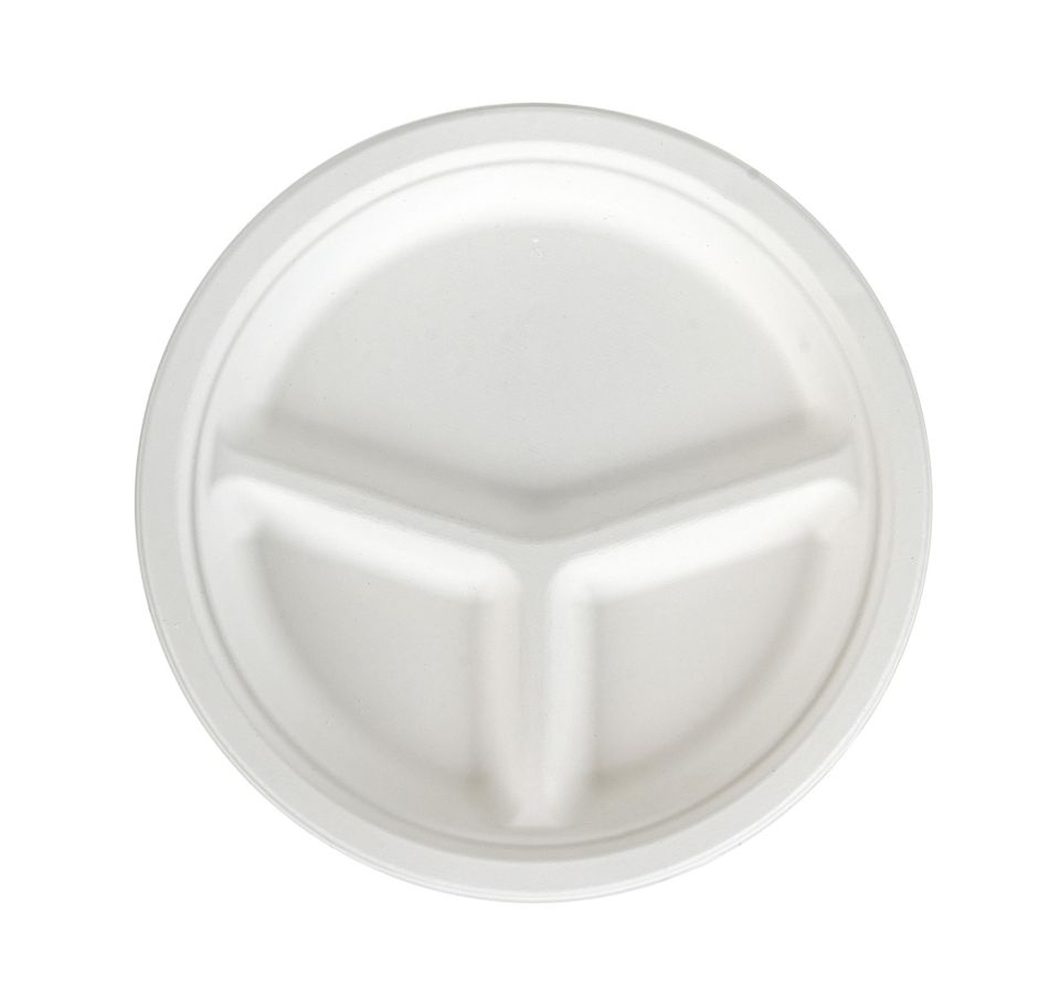 Assiette en bagasse de canne à sucre de 10 pouces à 3 compartiments, résistante à la chaleur, biodégradable, jetable, compatible micro-ondes, pour le camping