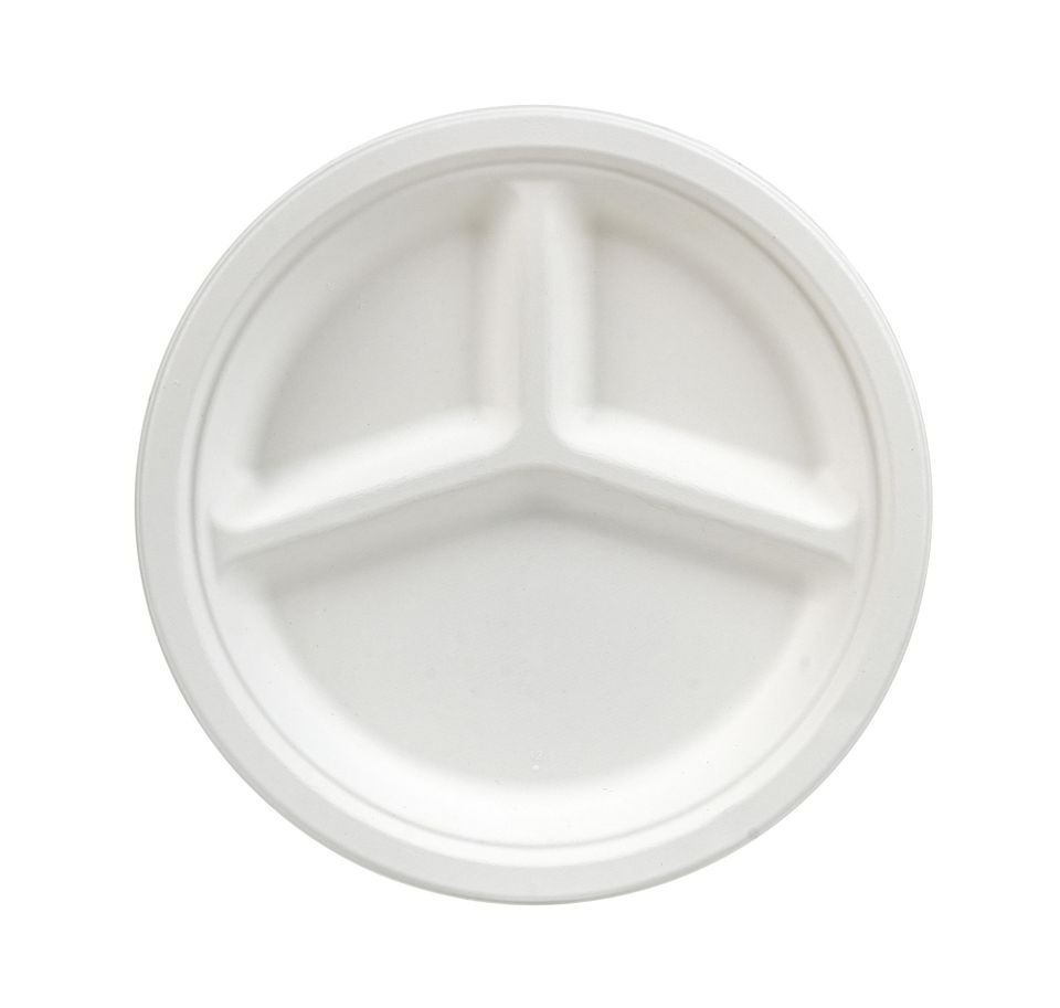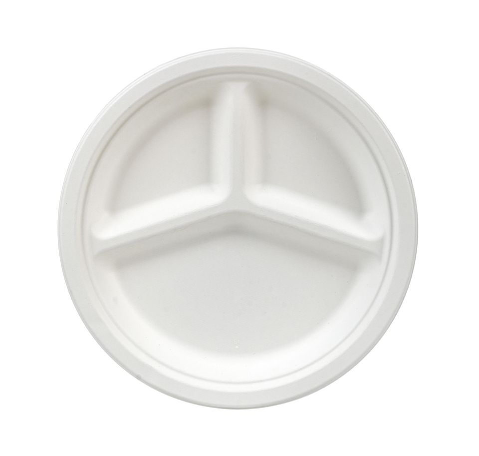 Assiette en bagasse de 10 pouces à 3 compartiments, résistante à la chaleur, jetable, biodégradable, compatible micro-ondes, vente en gros