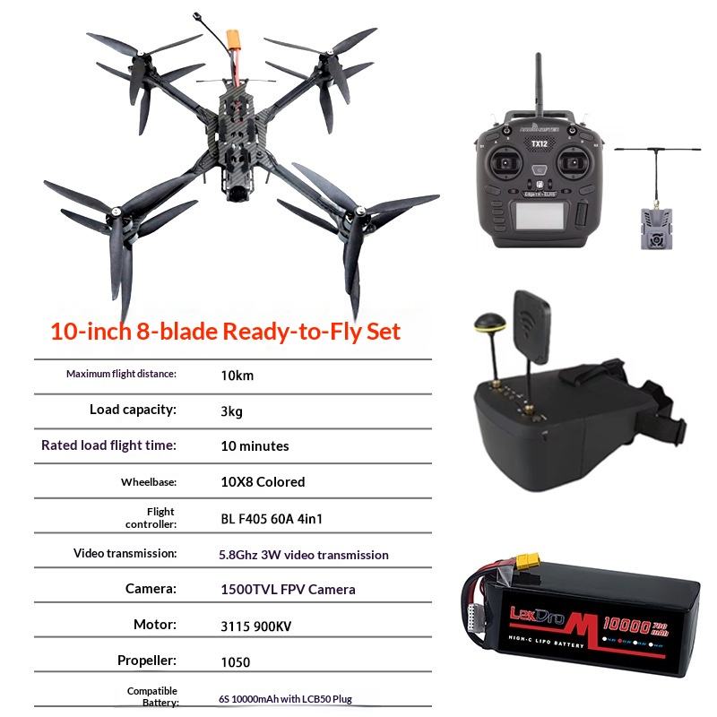 Drone FPV 10 pouces à 8 hélices, modèle de course 5 en 1, charge utile 3 kg, VTX 5.8G 3W, ELRS 915, 6S 10000mAh, longue portée, RTF